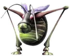 a cartoon character in a black suit and blue boots is standing up with his arms in the air .