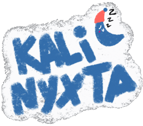 A charming blue sticker featuring a sleeping crescent moon wearing a beanie, with the Greek phrase 'Kali Nyxta' (Good Night).