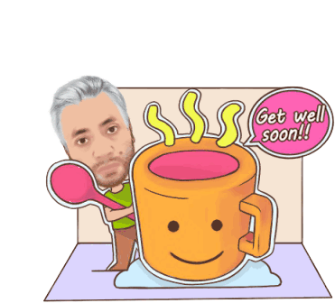 Bluekutug sticker featuring a man holding a spoon next to a smiling mug with steam, wishing 'Get well soon!!'.