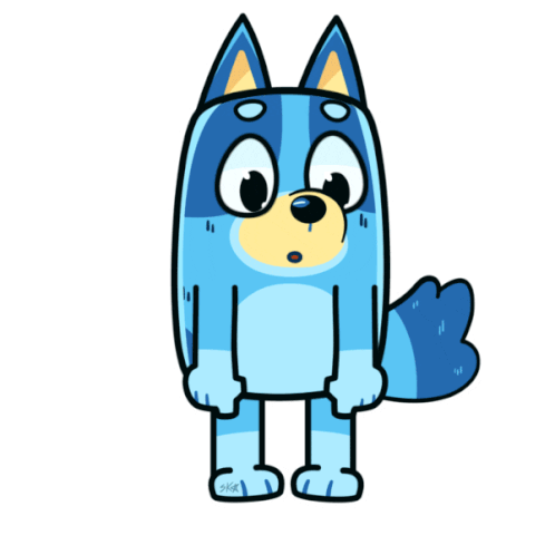 a cartoon drawing of a blue dog with a surprised look on its face