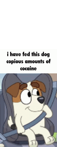 Bluey character Jack sits in a car seat, accompanied by the text 'copious amounts of cocaine' in this animated sticker.