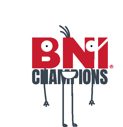 An animated sticker featuring a stick figure character with the BNI Champions logo, celebrating a win with a golden trophy.
