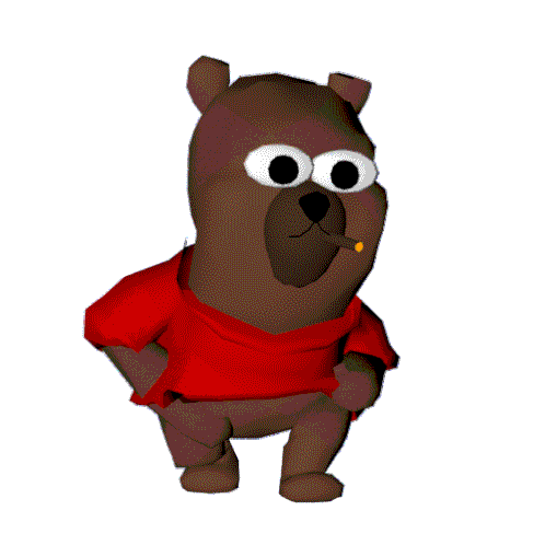 Bobo Bear, a brown cartoon bear in a red shirt, performs a quirky dance, possibly eating a snack.