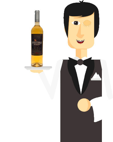 A cartoon waiter in a tuxedo holds a tray with a bottle of Pietro Marini wine, winking and smiling.