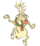 A cartoon reindeer with a festive wreath joyfully dances, spreading holiday cheer for Christmas.
