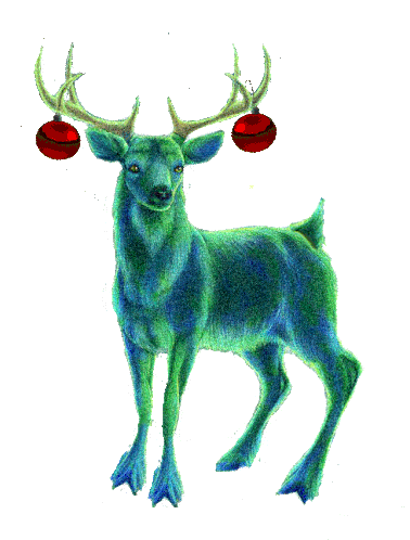 A vibrant green deer with large antlers adorned with blue Christmas balls, wishing a 'Boldog Karácsonyt'.