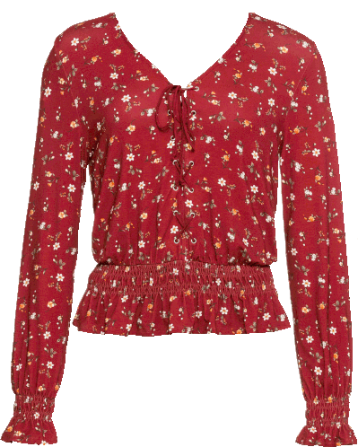 Stylish Bonprix red floral blouse with a V-neck and smocked details, perfect for a chic fashion statement.