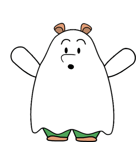 A cute cartoon bear character dressed as a ghost, holding a speech bubble that says "BOO!" for Halloween.