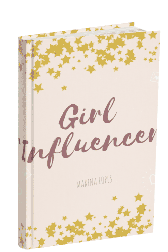 An animated book cover for Marina Lopes' 'Girl Influencer', featuring a light background and golden stars.