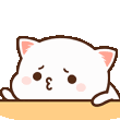 A cute white cartoon cat peeks over a surface, displaying a bored and slightly pouting expression.