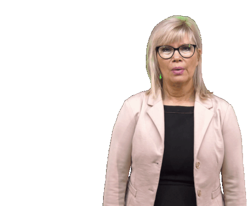 Simone Borris, wearing glasses and a blazer, shows a surprised expression before breaking into a warm smile.