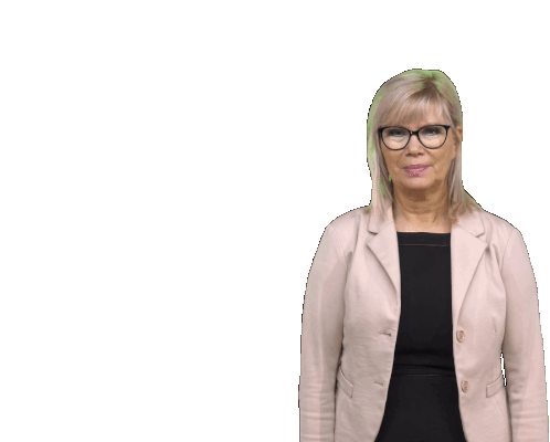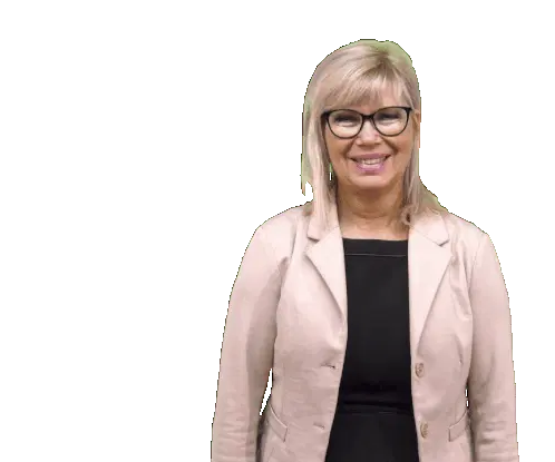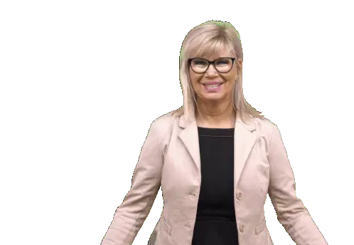 Simoneborris, a woman with glasses and a blazer, points directly at the viewer with a friendly smile.