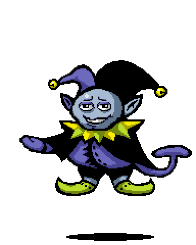 Jevil, the chaotic jester from Deltarune, bounces with a smug expression and one hand raised in this pixel art animation.