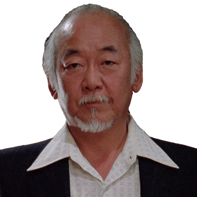 Mr. Miyagi, portrayed by Pat Morita from The Karate Kid, performs a respectful bow, conveying gratitude and wisdom.