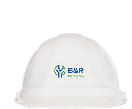 An animated white hard hat featuring the B&R Bouwgroep logo, perfect for construction-themed messages.