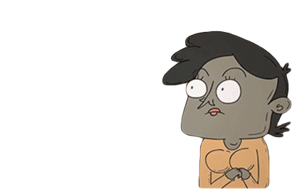 An animated character with dark hair and skin looks around suspiciously, her eyes narrowing and widening.