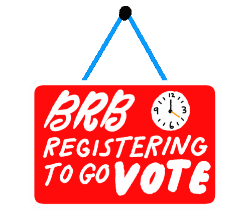 A red sign with white text reads 'BRB REGISTERING TO GO VOTE' next to a clock, encouraging civic duty.