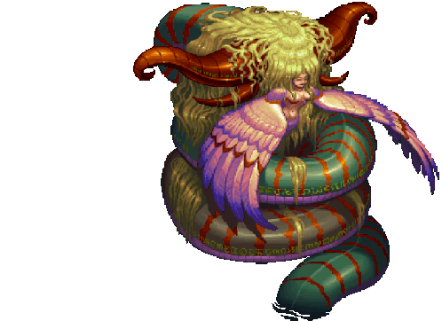 The powerful goddess Myria from Breath Of Fire, depicted as a winged serpent with horns and flowing hair, animated in pixel art.