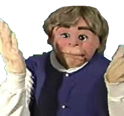 An animated sticker of a puppet character with brown hair and a blue vest, performing a classic shrug gesture with hands raised.