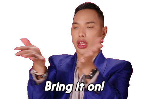 Eva La Queen from RuPaul's Drag Race confidently gestures 'Bring it on!' with a sassy and challenging attitude.