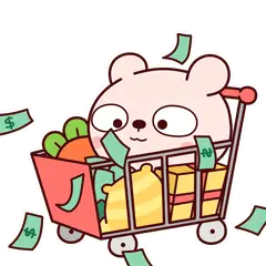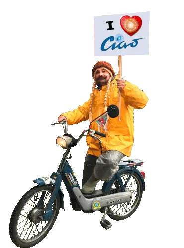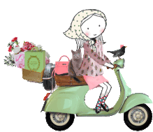 A charming animated sticker featuring a woman riding a light green moped, accompanied by a cat and a bird, with groceries and flowers loaded on the back.