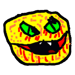A creepy, yellow monster face with green eyes and fangs, known as Brutez, for a Discord sticker.