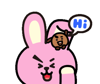 BT21's Cooky, with Shooky on its head, winks happily as Shooky greets with a cheerful 'Hi' in a speech bubble.