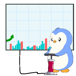 A cute cartoon penguin pumps an air pump, causing a cryptocurrency graph to rise with a green arrow, symbolizing a bullish market pump.