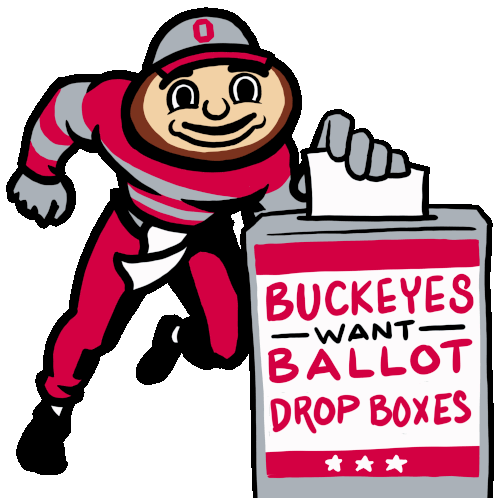 Brutus Buckeye mascot advocates for voting rights, placing a ballot into a drop box with the message 'Buckeyes Want Ballot Drop Boxes'.