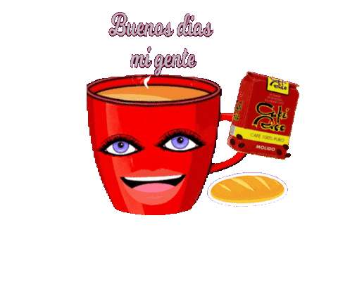 A cheerful red coffee cup with a face, steam, and 'Buenos dias mi gente' text, accompanied by coffee and bread.