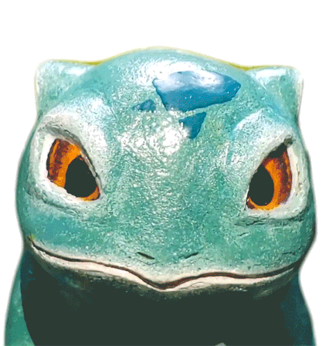 A detailed close-up of a finished Bulbasaur sculpture, showcasing its iconic green skin and orange eyes.