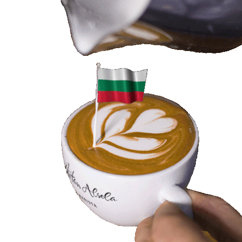 A barista pours milk to create beautiful latte art in a coffee cup, featuring a Bulgarian flag. By Dritan Alsela.