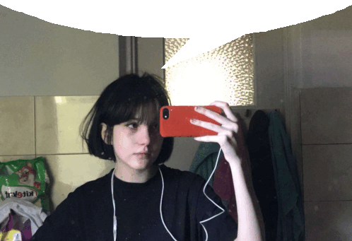 a girl is taking a selfie in front of a mirror with a bag of noodles behind her