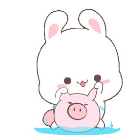 A playful white bunny holds a small pink piglet that appears to be crying, creating a mix of cute and mischievous emotions.