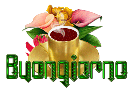 A golden coffee cup with flowers and 'Buongiorno' in green letters, perfect for a warm good morning greeting.