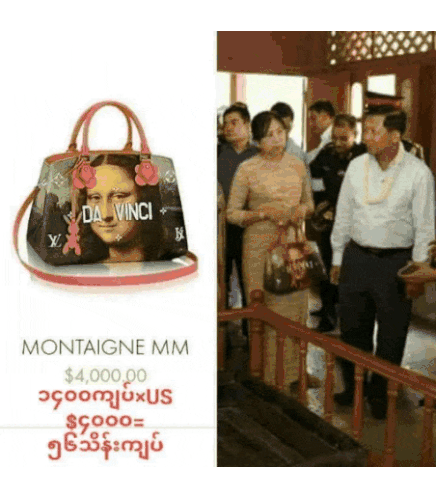 Burma Army context: A woman, likely Aung San Suu Kyi, carries a Louis Vuitton 'Da Vinci' bag. Features htay, than, thanhtay.