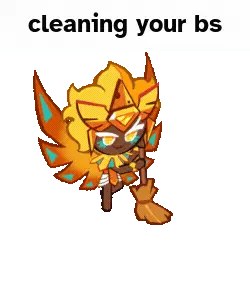 Animated pixel art sticker of Burning Spice Cookie, a devilish character wielding a fiery sword.