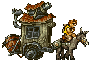 A pixel art sticker featuring a man riding a donkey pulling a detailed wooden cart equipped with a cannon, in the style of Metal Slug.