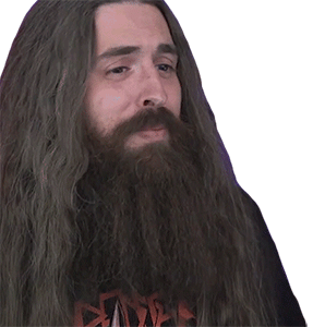 Samus Paulicelli, a man with long hair and a beard, bursts into laughter, unable to hold it in.