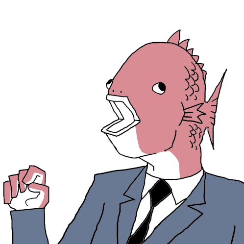 Business Fish Quan, a character with a fish head, is depicted in a suit, sweating and looking shocked with an open mouth.