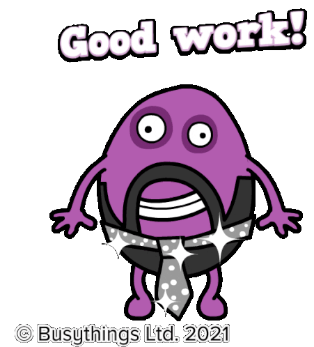 The Busythings Beard Man gives two thumbs up with a shiny smile, saying 'Good work!' to celebrate success.
