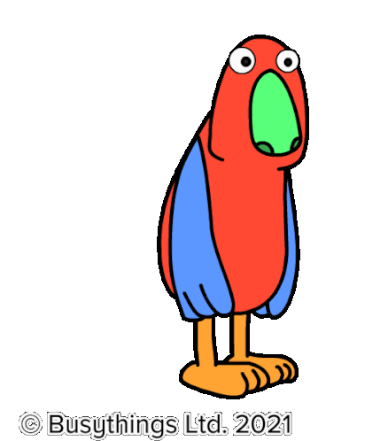 A cheerful red cartoon bird from Busythings gives two enthusiastic thumbs up, conveying approval and positivity.