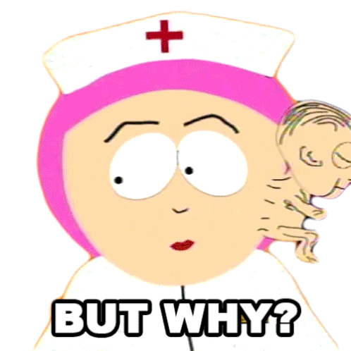 South Park's Nurse Mary looks confused, holding a baby-like Gollum creature, asking 'But Why?'