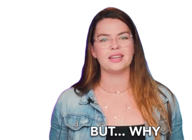 A woman in glasses and a denim jacket expresses confusion, asking 'But why?' and 'What's the reason?'