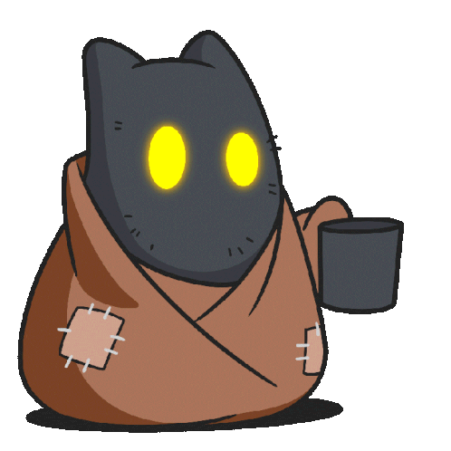 An animated sticker of the Buu Beggar character, a black cat-like figure with glowing yellow eyes and a patched robe.