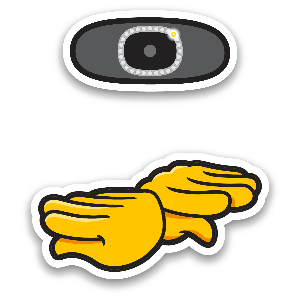 Animated sticker featuring yellow cartoon hands performing an ASL sign, accompanied by a video relay service device. Ideal for communication.