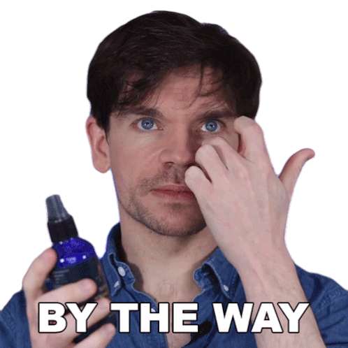 Robin James, a man with dark hair and a beard, rubs his eyes while holding a blue bottle, saying "BY THE WAY".