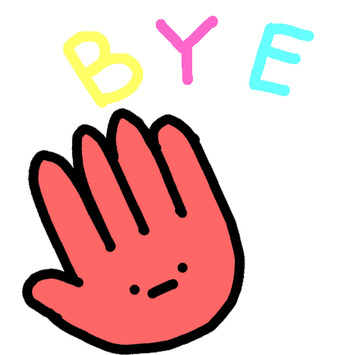 A cute, cartoon red hand with a smiling face waves goodbye, with the colorful word "BYE" above it.