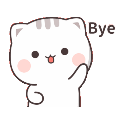 A charming white cartoon cat with pink cheeks and grey stripes waves goodbye, accompanied by the word 'Bye'.