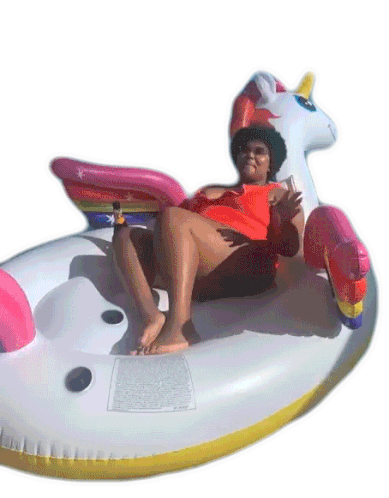 Lizzo waves goodbye from a large, colorful unicorn pool floatie, enjoying a sunny day.